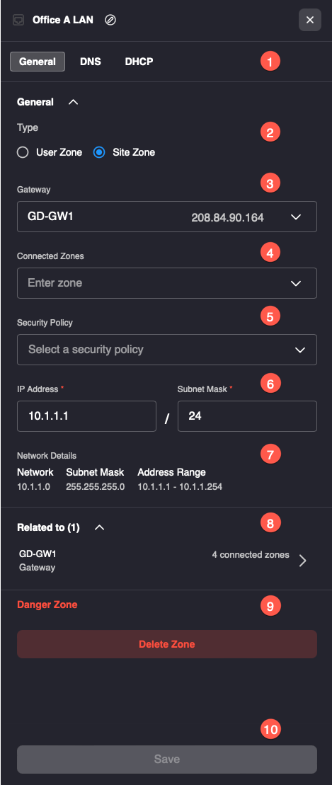 3. Configure the gateway (visually represented by the line connecting the zone to the gateway in the Network Map)