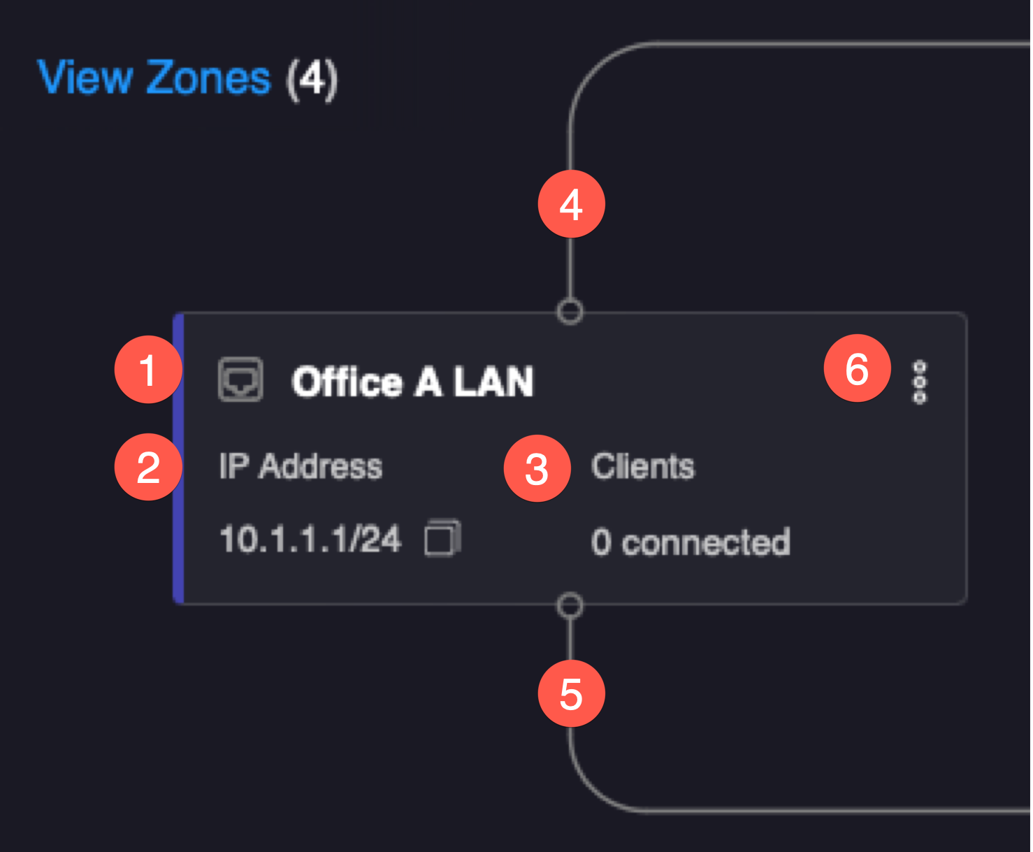 Once you create your zone, A visual representation will appear in the Network map, showing the zone name, connections, IP address, and number of clients connected.