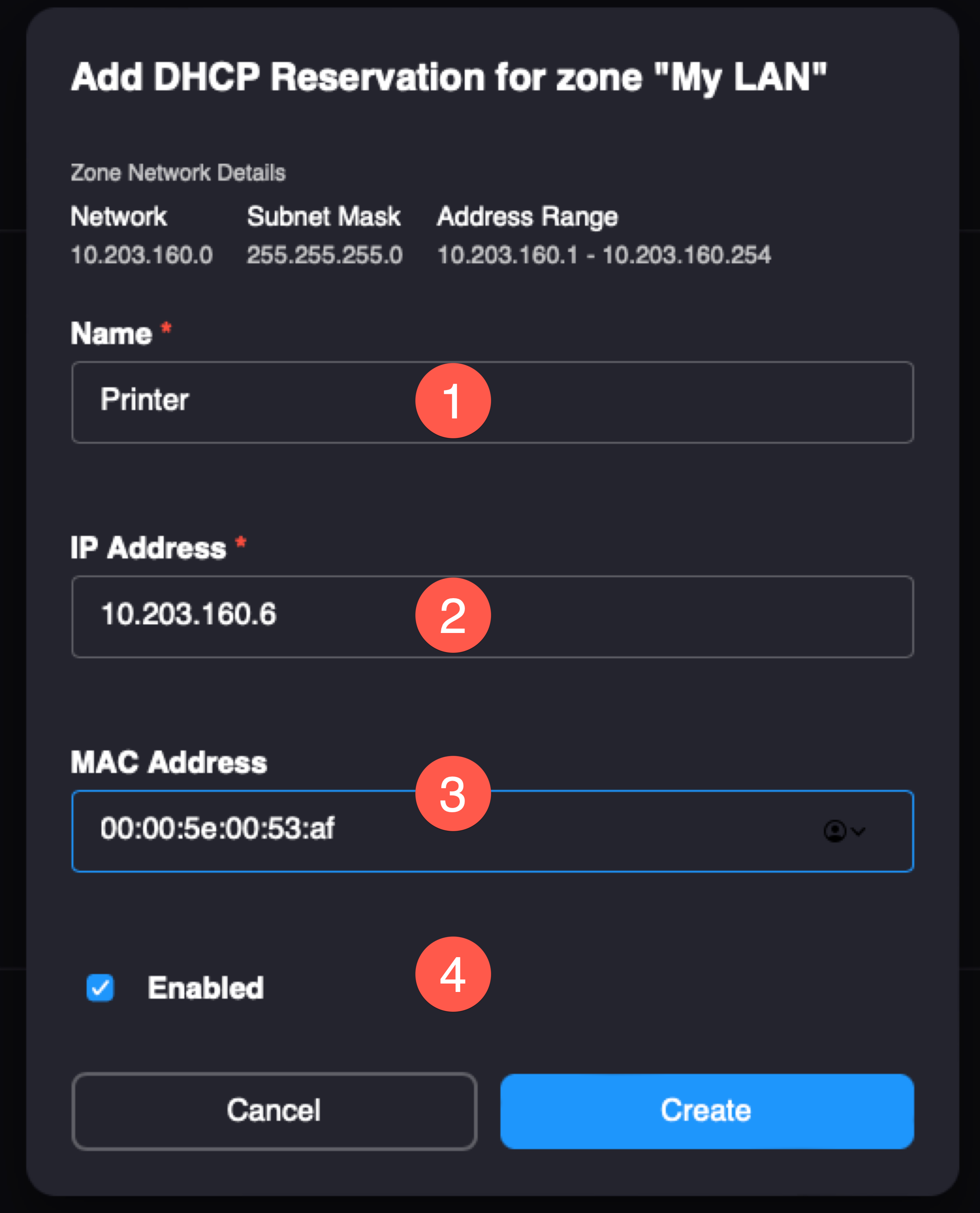 3. DHCP Options lets you enter additional option codes for this zone. You can pick a reservation either inside or outside the DHCP pool.