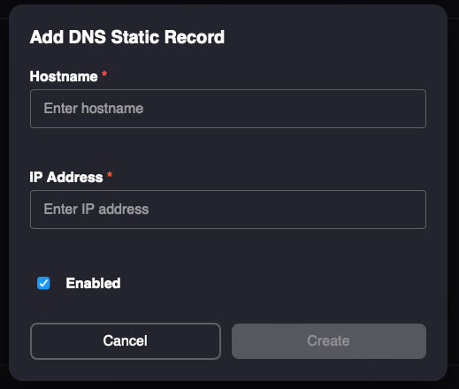 4. Static records: Use this option to make DNS records always return a specified IP Address. Click the Add link, then enter the hostname and IP address, and check the Enabled box