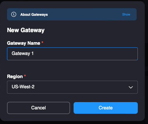 3. Name your gateway then use the drop-down menu at the top right-hand corner of your screen to select the appropriate gateway point of presence (POP) for your geographic region. When finished, click the Create button.
