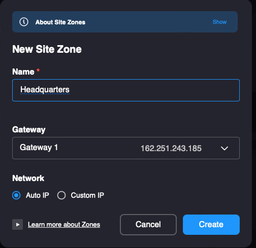 3. Name your zone, then use the Gateway drop-down menu to assign the zone to the gateway you created earlier. When finished, click the Create button.