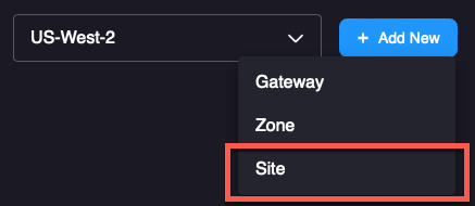 2. The New Site dialog box will appear. Name your site, then use the drop-down menu at the top right-hand corner of your screen to select the appropriate gateway for your geographic region.