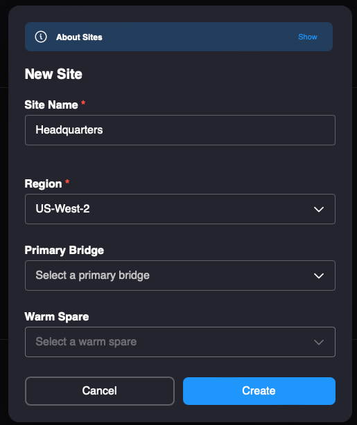 3.. Use the drop-down menus to select your primary bridge, and assign a warm spare, if applicable. When finished, click the Create button.