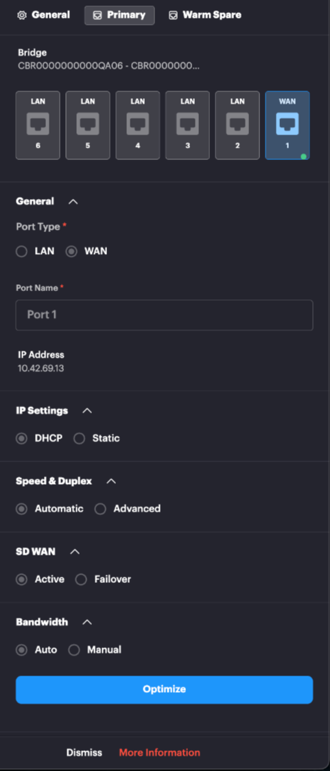 7. Click the Primary tab, select the WAN port from the graphic, then click the Optimize button to optimize your site (this can take up to 15 minutes). Once complete, LAN port 6 should now pass traffic through your cloud edge, completing the setup.