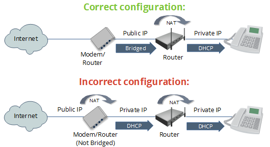 Double NAT is a term used to describe a situation when a phone is behind two routers in line, and they are both trying to route the traffic. The router is the boundary between the public and private subnet. There can only be one router to ensure voice quality.
