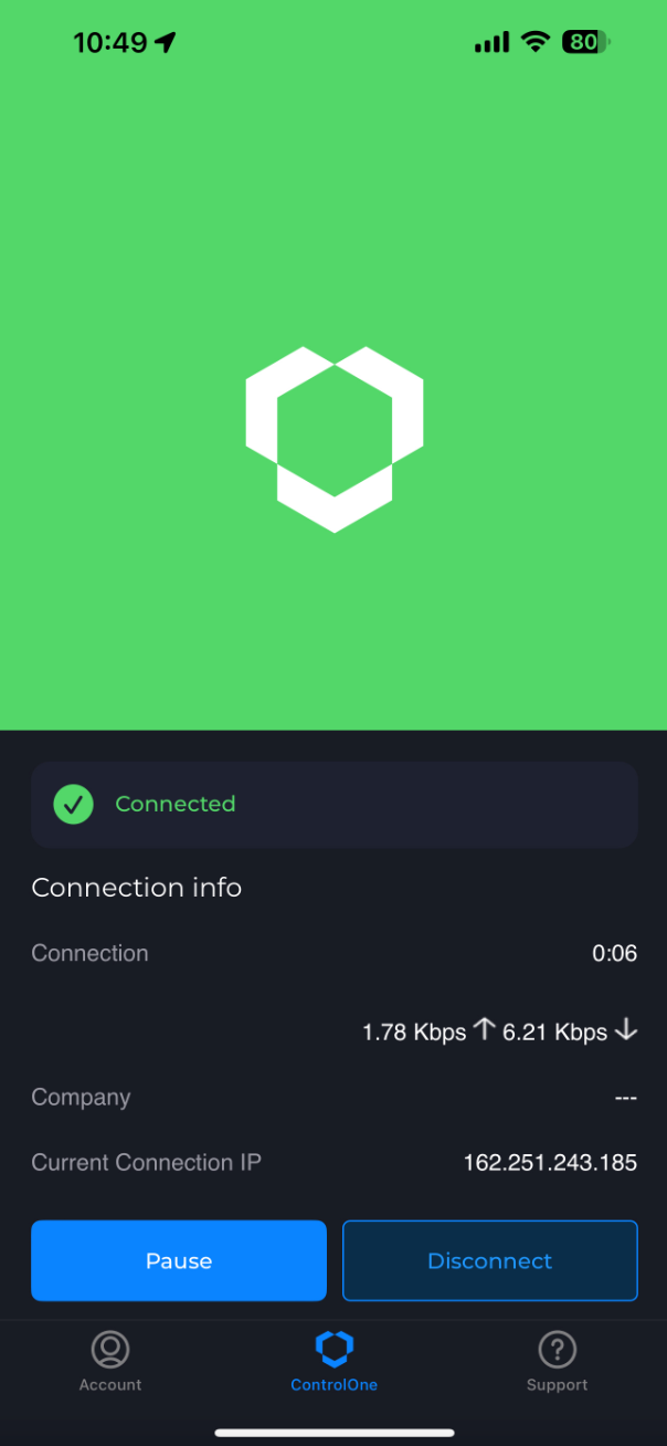 The App will automatically connect to your ControlOne network when the profile is installed. The main screen will also display the current connection status and secure gateway IP.