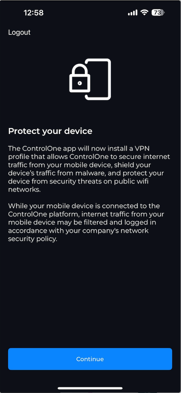 3. To continue, the App must install a VPN profile with the OS to provide secure connectivity for internet traffic through ControlOne. Tap Continue, then inside the pop-up prompt tap Allow and follow authentication prompts to install the profile and complete App setup.