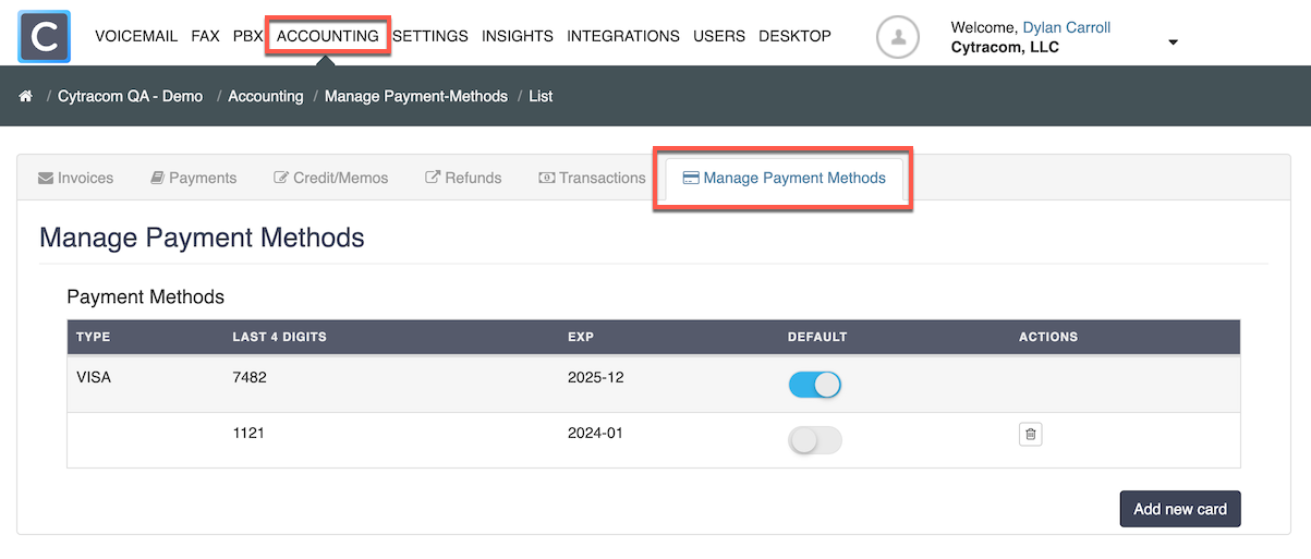 You can now add, remove and change default payment methods for your Cytracom. UCaaS service.