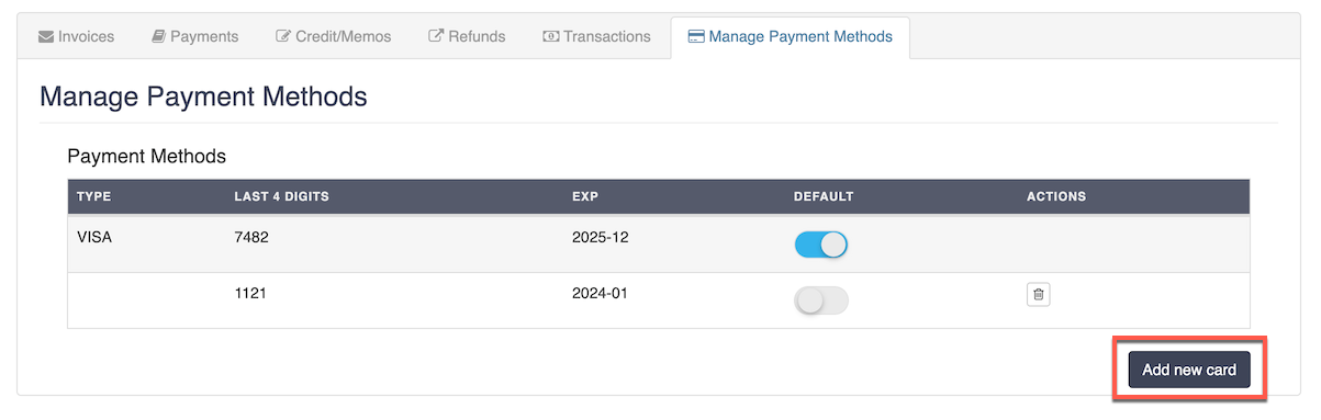 1. On the Manage Payment Methods screen, click the Add new card button.