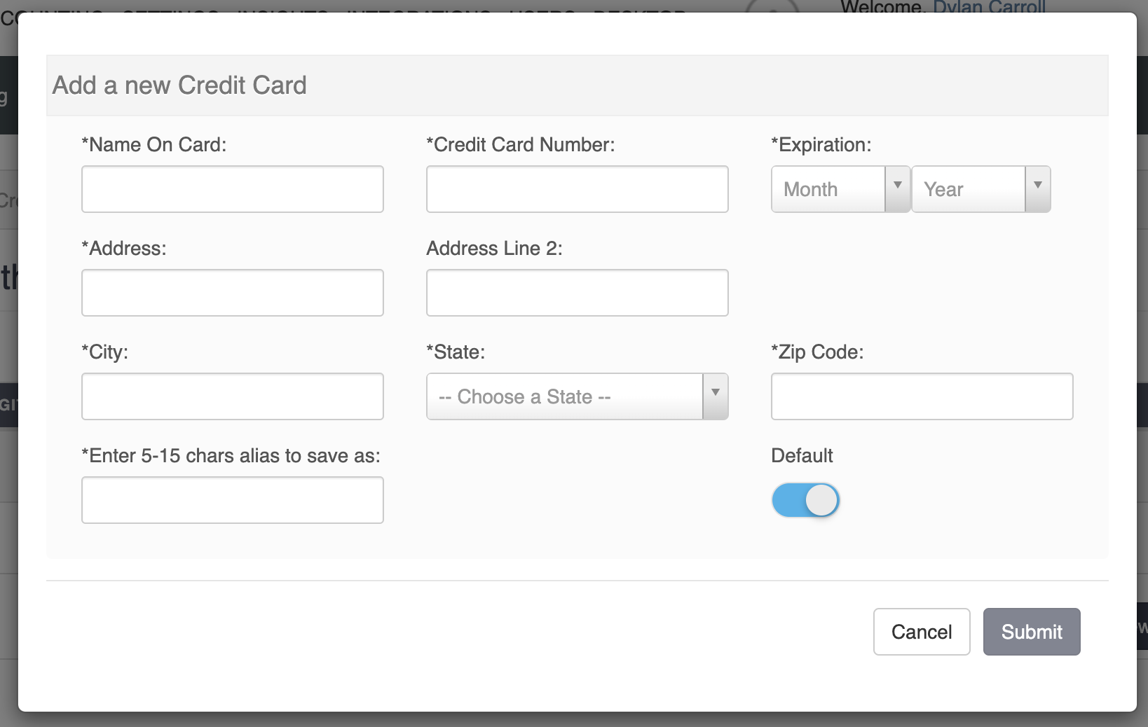 2. A dialog box will appear. Enter the requested credit card information, and click the Default slider if you wish to make this the default card for payments. When finished, click the Submit button.
