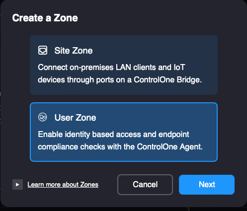 3. The Create a Zone dialog box will open. Select User Zone and click the Next button.