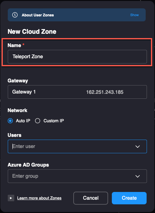 In this step, you will create a dedicated zone for Teleport access and troubleshooting.