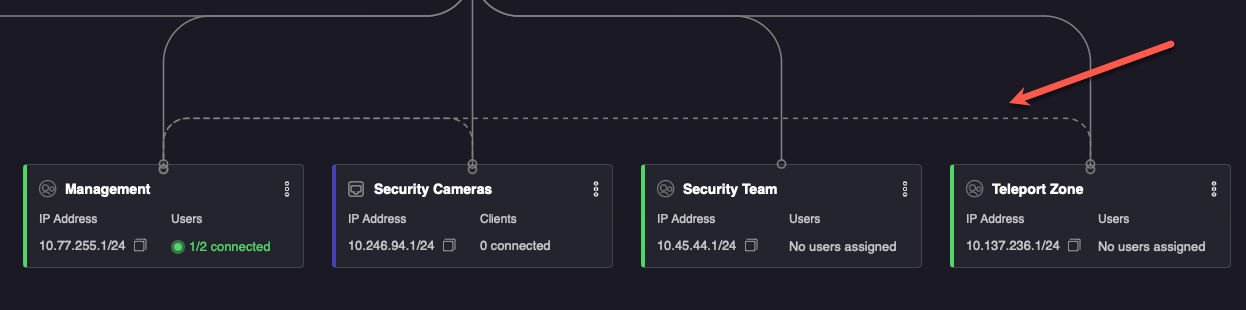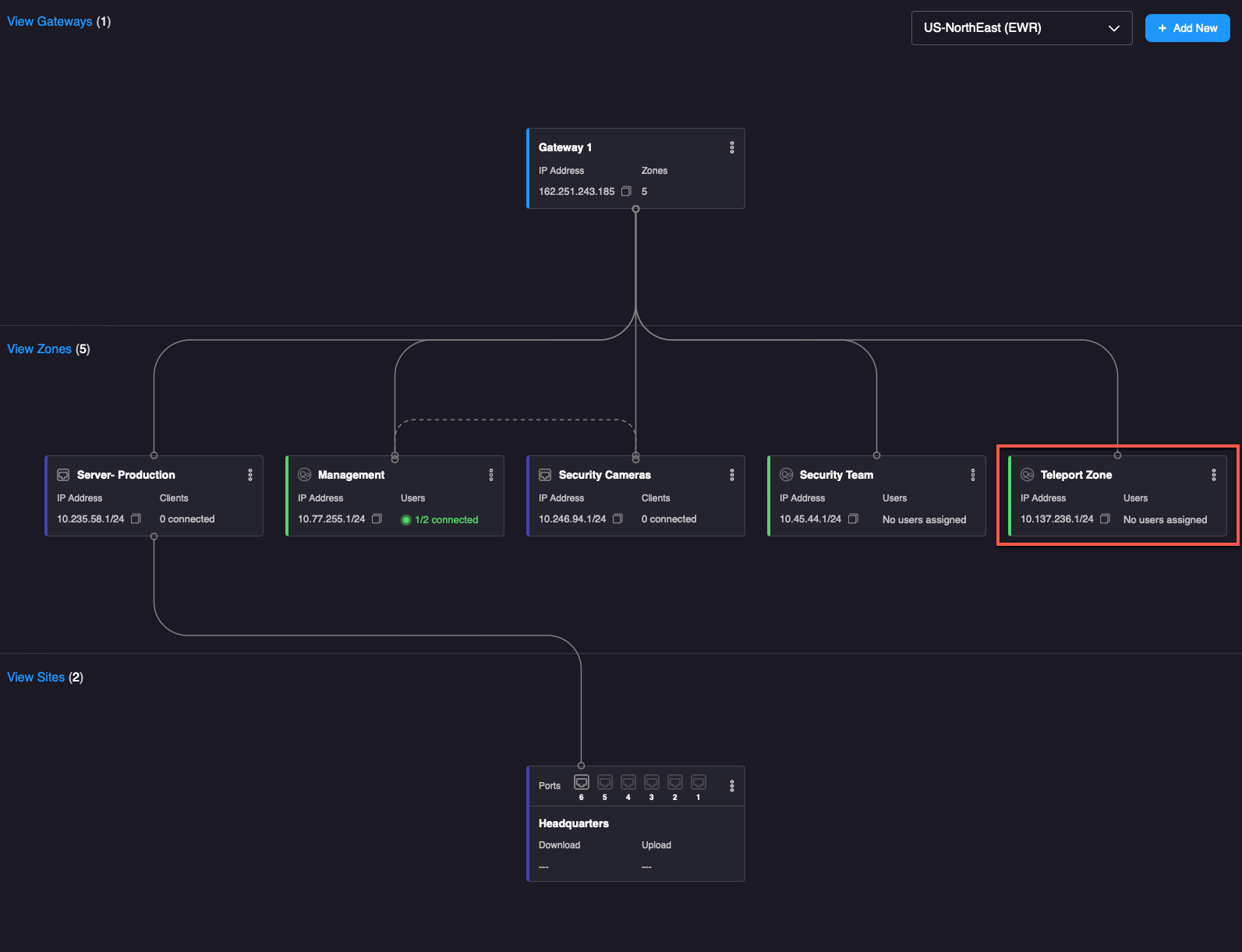 1. In the Network Map, hover your cursor over the Teleport zone. and click the blue dot that appears on the right-hand edge of the zone box.