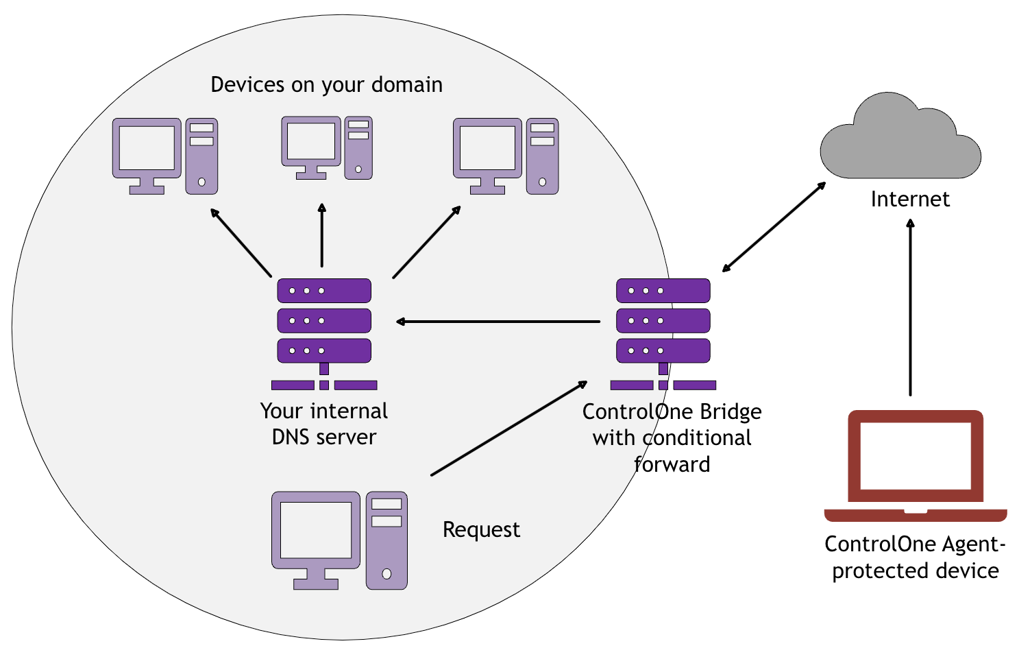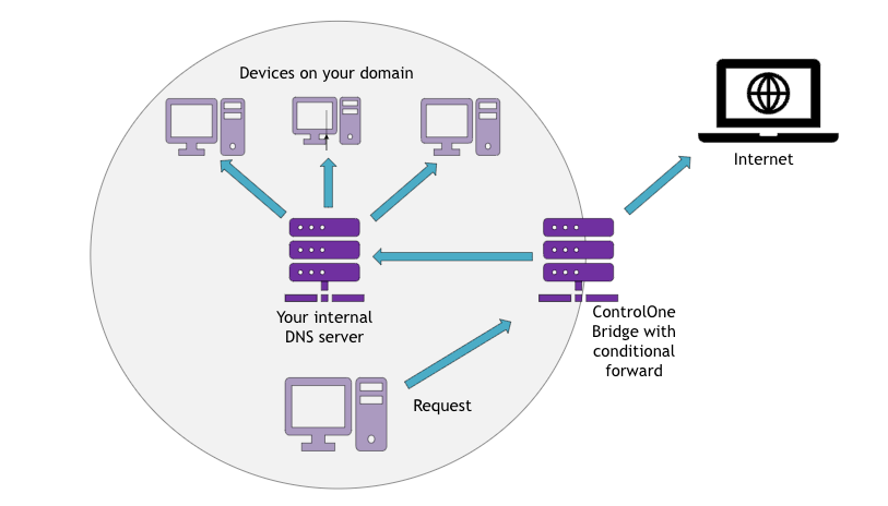 A DNS Conditional forward is a setting on the ControlOne Bridge that forwards all DNS requests for a specific DNS domain to the authoritative server of your choosing.