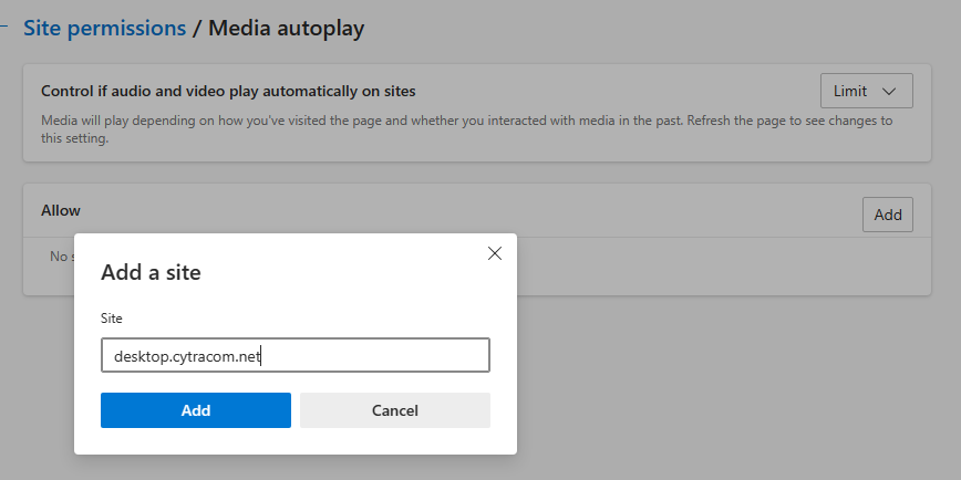 Navigate to Preferences→ Cookies and site permissions -→ Media autoplay-→ Add (next to Allow), and enter "desktop.cytracom.net"