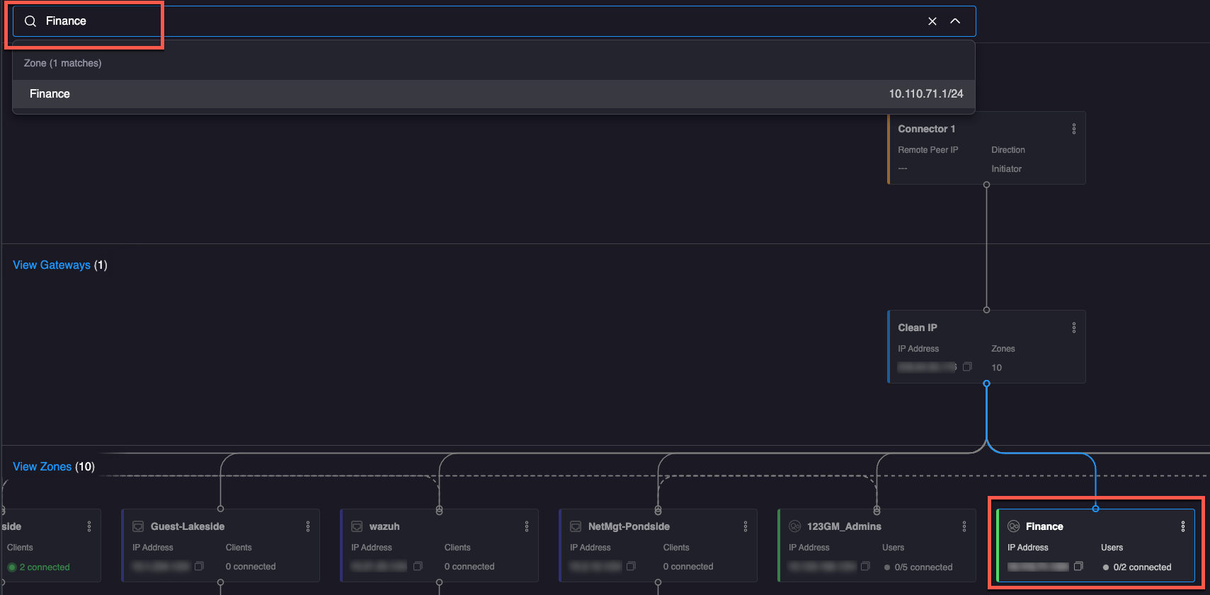 To search for a network element (Site, Gateway, Zone, or Connector), begin typing its name in the search bar. ControlOne will automatically complete the search entry and highlight the element.