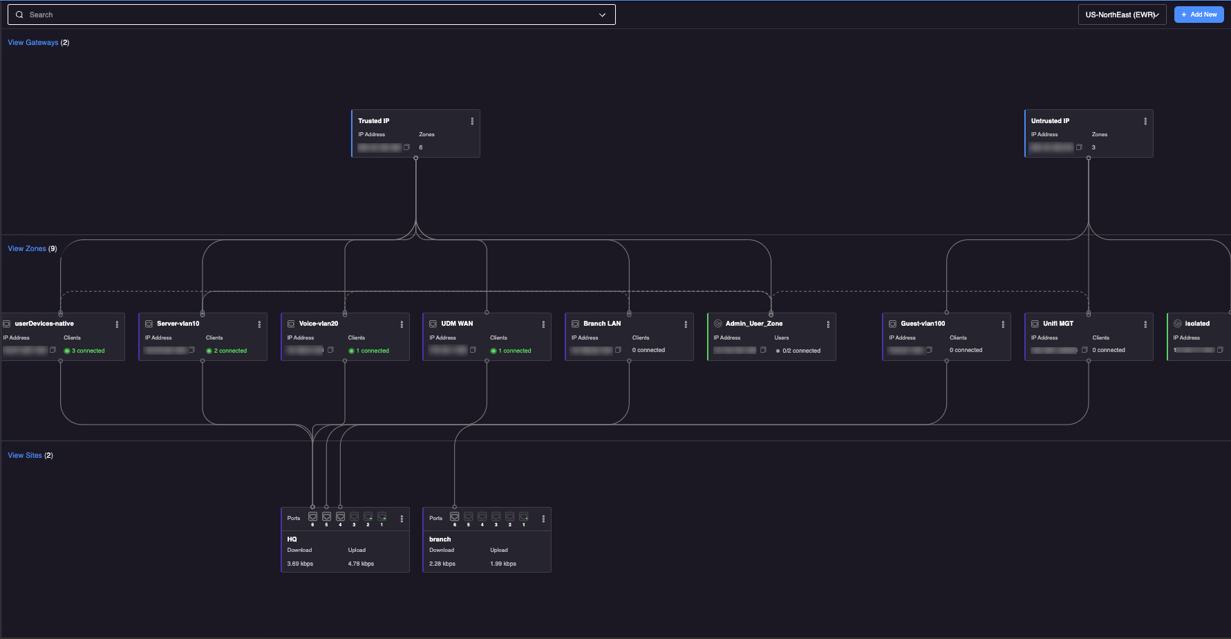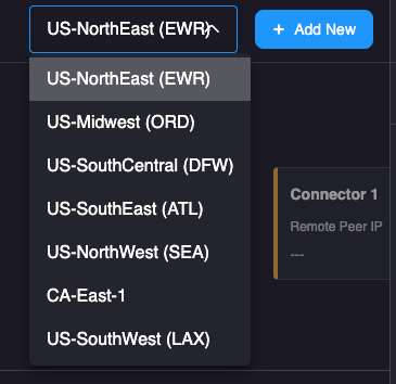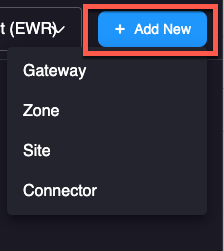 From the network map, you can create new Gateways, Sites, Zones, or Connectors. To do so, click the Add New button in the top right -hand corner of the window, then select the element type from the drop-down menu.