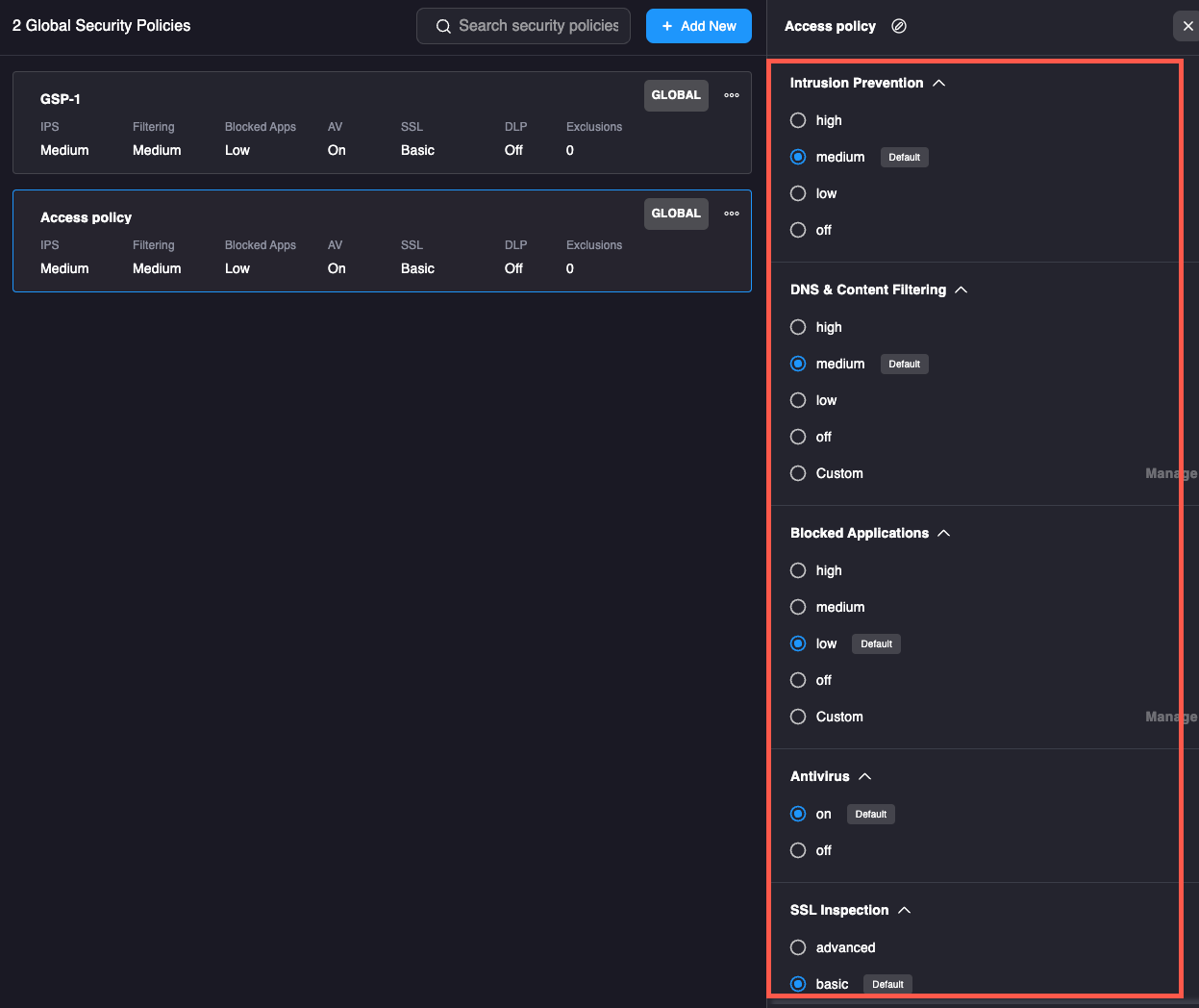 1. On the Global Security Polices page, click the policy to open configuration options.