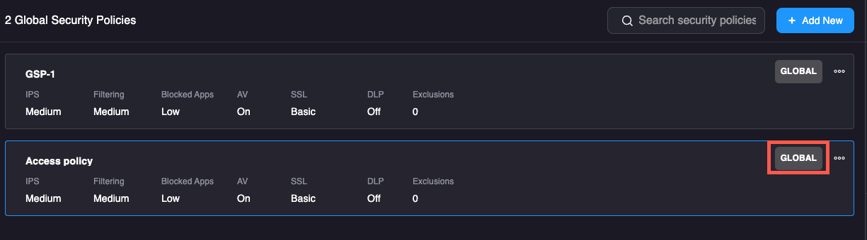 1. On the Global Security Policies page, click the Add New button in the upper right-hand corner of the window.