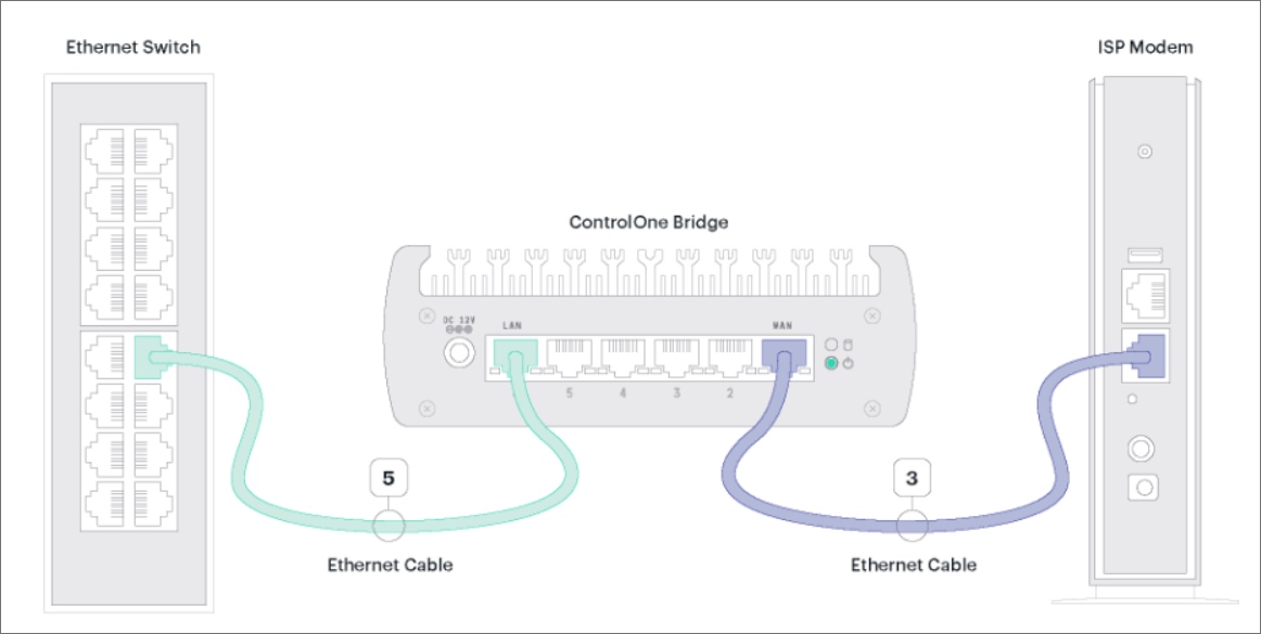 2. Connect an ethernet cable from the ISP modem to WAN port 1 on the ControlOne Bridge. see the cable marked 2 in the diagram above.