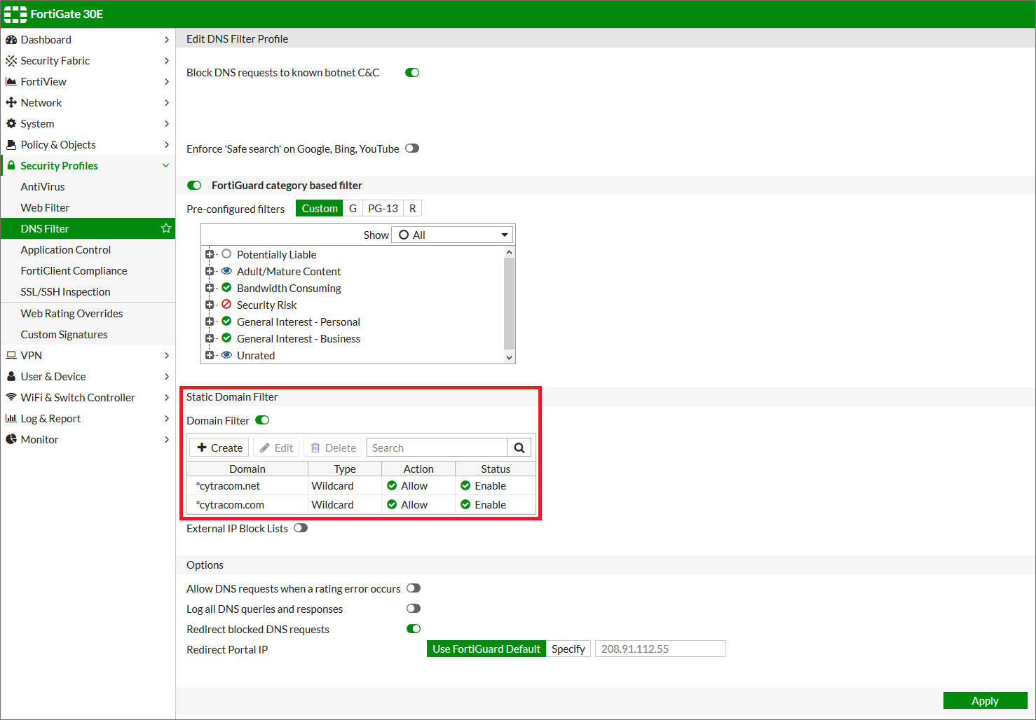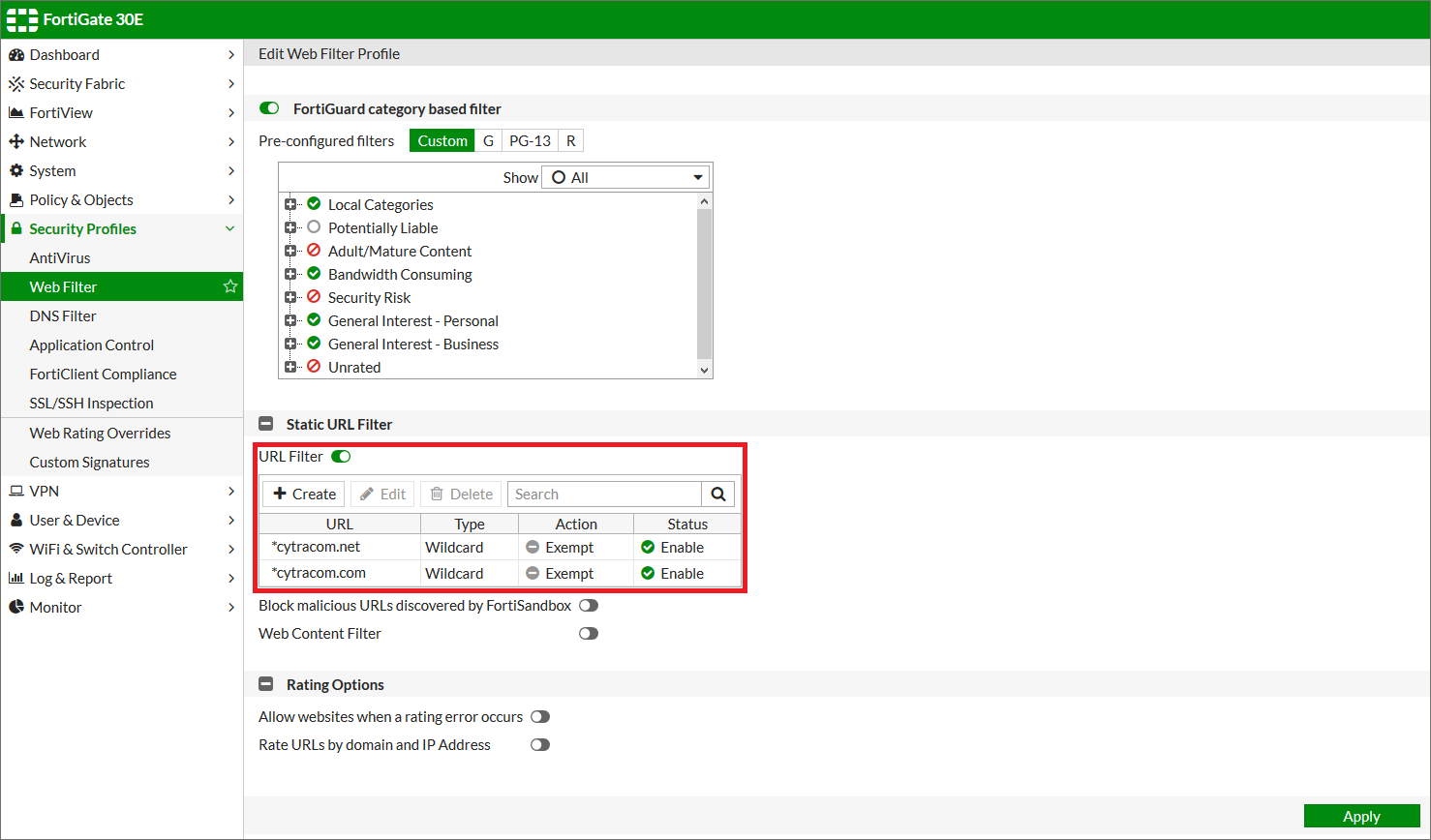• FortiGuard category based filter: Enabled. Choose your filter level.